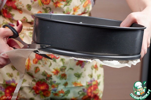 Дно формы застелите пергаментом. Это очень легко- кусок нужной длины прижмите бортами формы, а потом обрежьте лишнее.