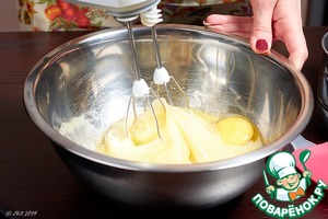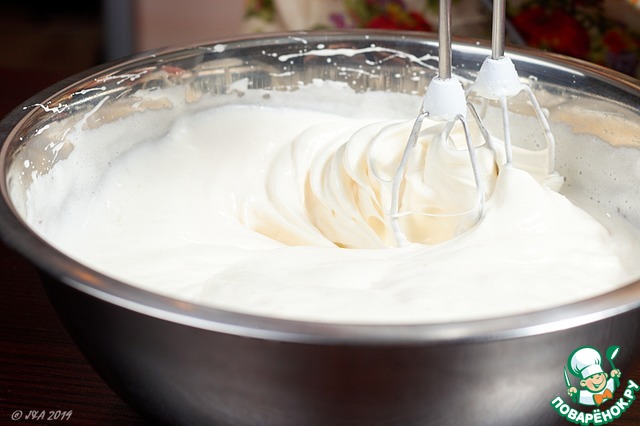 Взбивать нужно до тех пор, пока яйца не станут похожи на взбитые сливки. Время взбивания зависит от мощности миксера, минимум 5 минут.