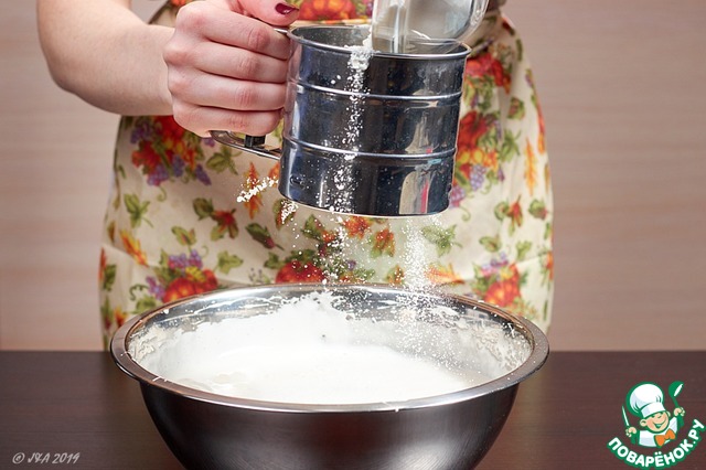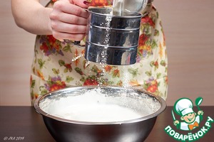 В два этапа просейте в яйца муку. Распределяйте ее по всей площади пены, иначе она под своей тяжестью провалится на дно и будет очень сложно перемешать.