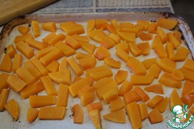 Очистить тыкву от шкурки и семян, нарезать ее на кубики или дольки, выложить на противень и запечь в духовке минут 20 до готовности.