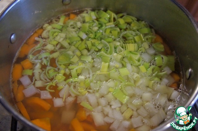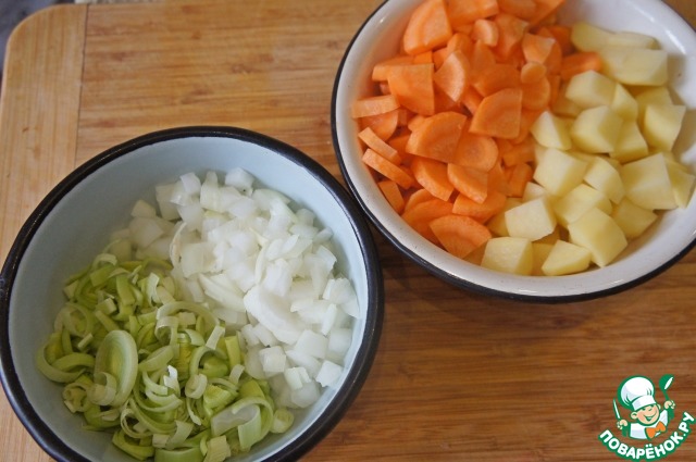 Стебель лука-порея нарезать колечками, репчатый лук, картофель и морковь – небольшими кубиками.