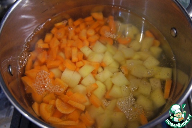 Воду довести до кипения, засыпать морковь, варить 10 минут, затем добавить картофель и варить после закипания на маленьком огне еще 20 минут.