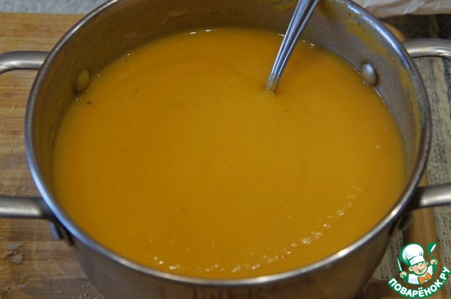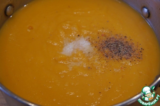 Вылить обратно в кастрюлю, посолить и поперчить по вкусу. Если тыква не сладкая, добавить немного сахара.