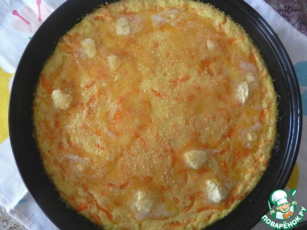 Через 30 минут, сверху на запеканку положить кусочки сливочного масла и присыпать коричневым сахаром. Отправить в духовку еще на 10 минут. При необходимости можно подержать под грилем еще 5 минут до образования золотистой карамельной корочки.