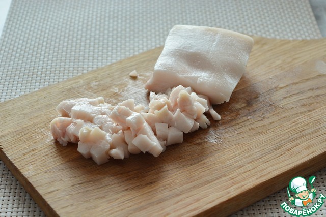 Сало нарежьте кубиками 0,5 см. Половину отложите в сторонку
