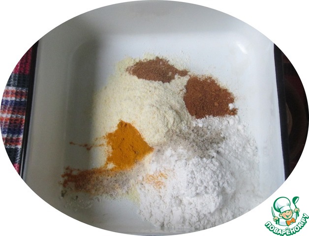В емкость насыпаем оба вида муки, соль и специи