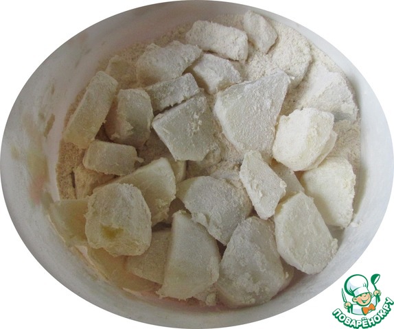 В результате тряски каждый ломтик картошки покрывается мучной смесью. -
