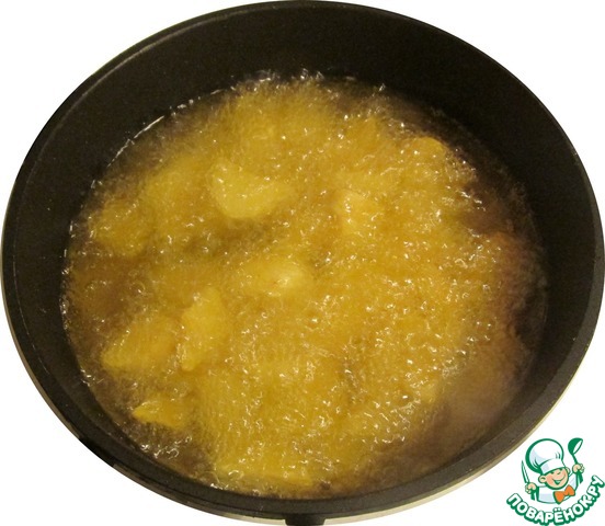 В сотейнике или в кастрюльке хорошо разогреваем растительное масло без запаха. Отправляем картофельные ломтики во фритюр.
