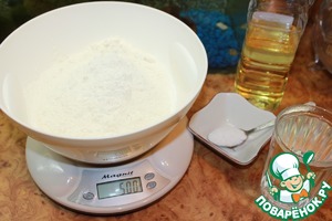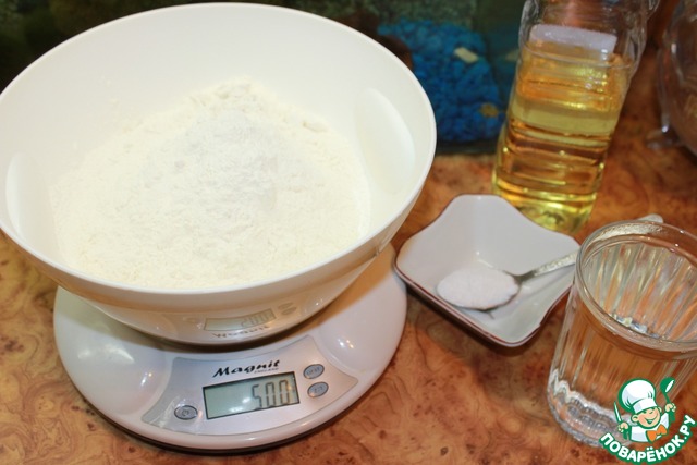 Муку просеять. Воду вскипятить. В воде растворить полностью соль. В муку добавить воду и масло. Сначала замешивать лопаткой а когда тесто чуть остынет вымешивать руками.