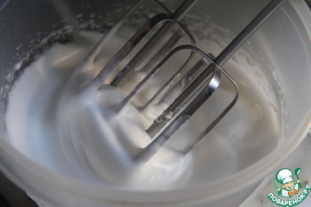 Взбить белки с оставшимся сахаром (40 грамм), вводя его в 2 этапа, до пышного состояния.