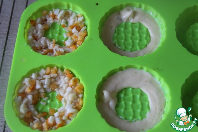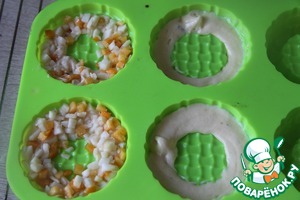 С помощью кондитерского мешка (так удобнее) наполнить формочки на 1/3 объема. Уложить кусочки фруктов (или ягод).