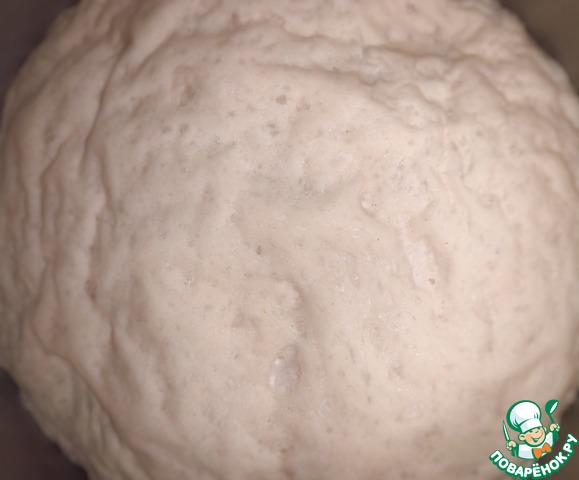 После того, как опара готова, добавить в неё соль, растительное масло (50мл.) и перемешать. Готовую смесь добавить в муку и замесить мягкое тесто. Оставить накрытым в теплом месте на 1 час.