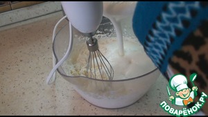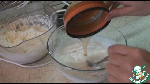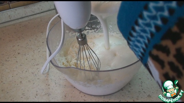 Потом постепенно вливаем сливки с желатином к сыру с рикоттой и взбиваем миксером.
