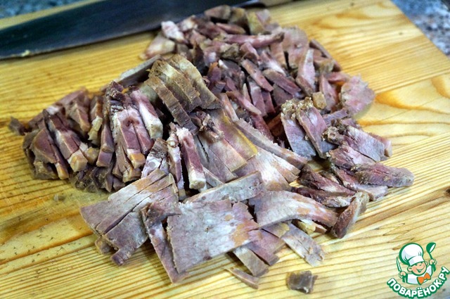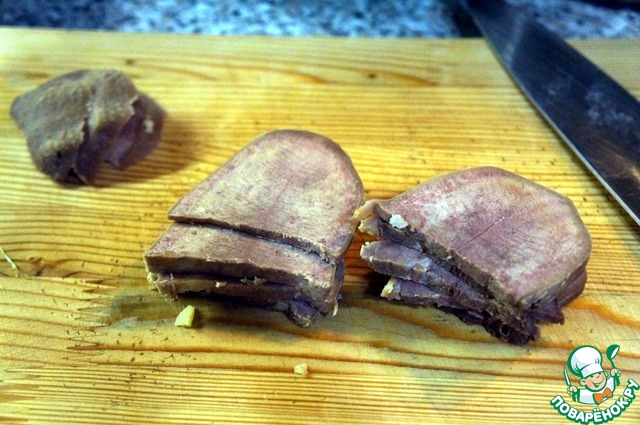 - Язык говяжий (предварительно отваренный и ошкуренный) — 300 г