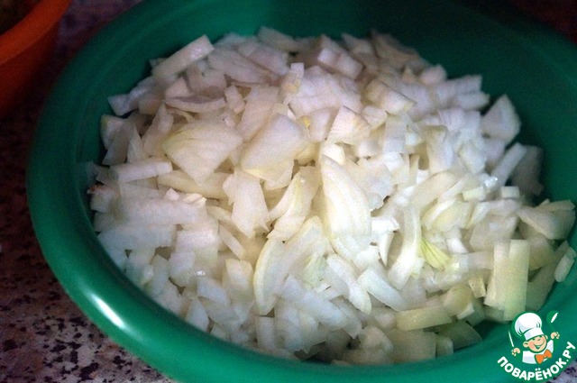 Пока варятся макароны, займемся остальными ингредиентами. Лук порезать полукольцами или четвертинками.