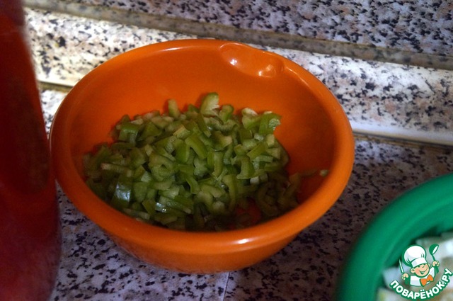 Перец освободить от семян и перегородок, порезать полукольцами.