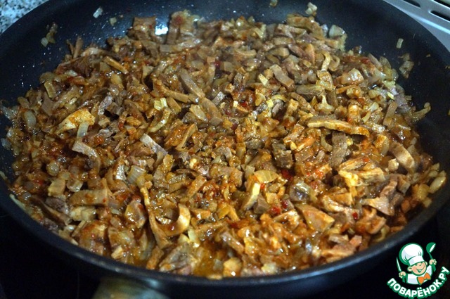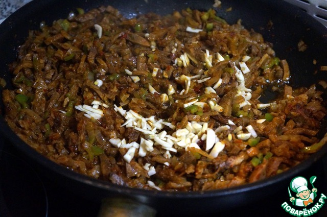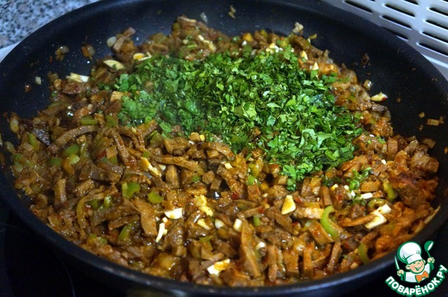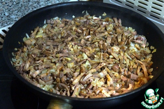 Добавить язык, перемешать, жарить примерно 5 минут.