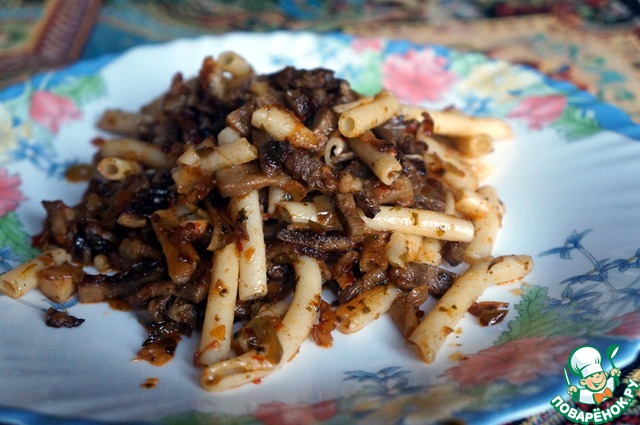 Тем временем макароны готовы, слить воду, смешать их с содержимым сковороды, перемешать, слегка прогреть вместе – и подавать.