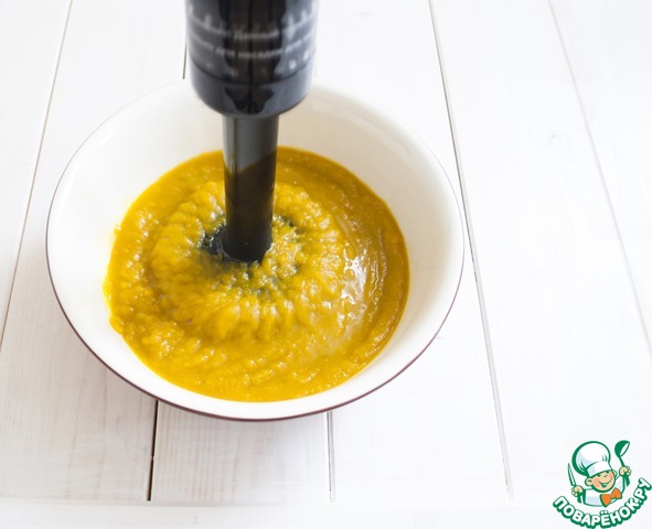 Потом измельчила приготовленную тыкву вместе с кипячёным молоком погружным блендером.