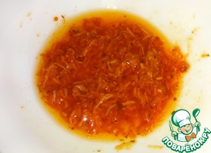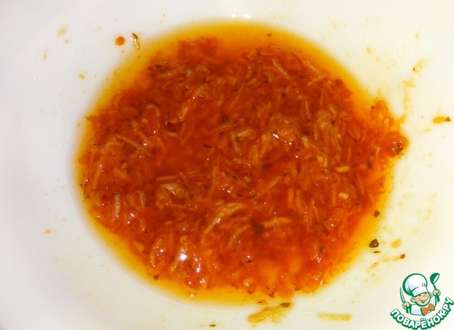 В пиалке смешать растительное масло, измельчённый чеснок и соль. -
