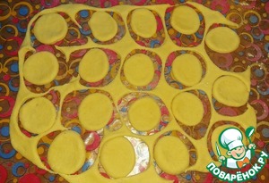 Тесто разделить на 2 части и тонко раскатать. Вырезаем кофейной чашечкой кружочки.