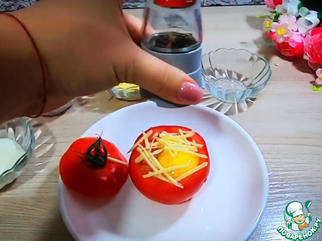 • Внутрь помидора добавляем растительное масло 1 чайную ложку и обмазываем, внутрь помидора добавляем сметану, колбасу, одно яйцо. Сверху посыпаем сыром