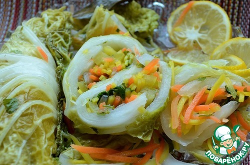 На капустный лист выложить горкой овощи и закрутить рулетом.