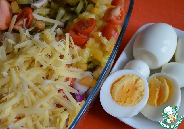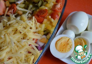Сыр натереть, яйца почистить, нарезать. Два перепелиных