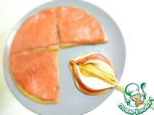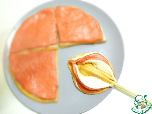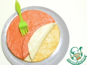 Смазать с обеих сторон растительным маслом. Собрать в две разноцветные трехслойные лепешки. -