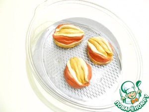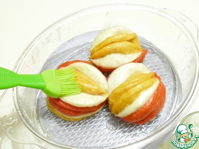 Поэтому сразу окунаем донышко каждой булочки в блюдце с растительным маслом, выкладываем на решетку пароварки или мантоварки.