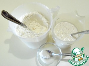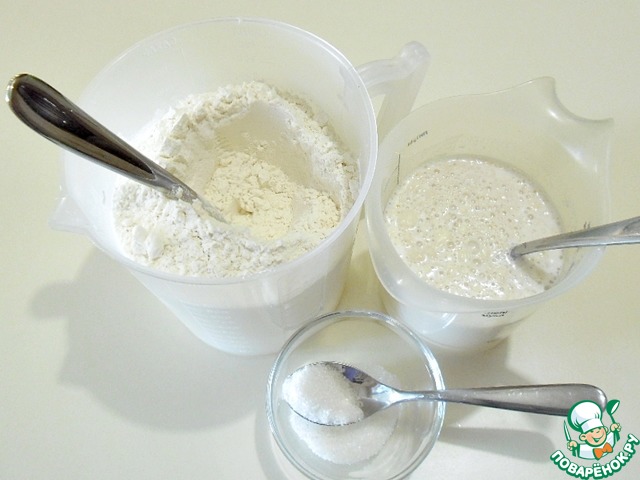 В первую очередь залить дрожжи тёплым молоком, добавить 1 ч. л сахара и 3 ст. л. муки, взять от общего количества.