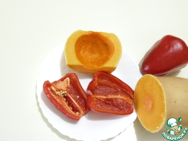 Я отделила перец и тыкву от кожицы ложкой, мякоть размяла вилкой. -