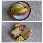 У двух частей сделать углубления, выложить в одну часть тыквенное пюре с куркумой, в другую часть - пюре из перца и паприку. По желанию можно добавить по капле пищевого красителя. -