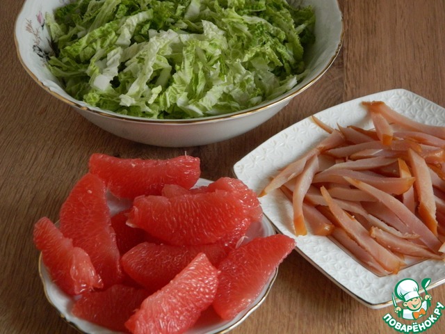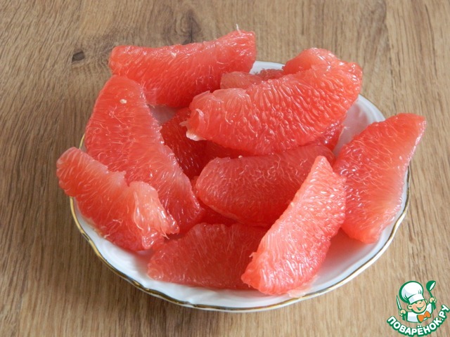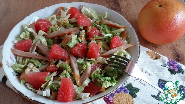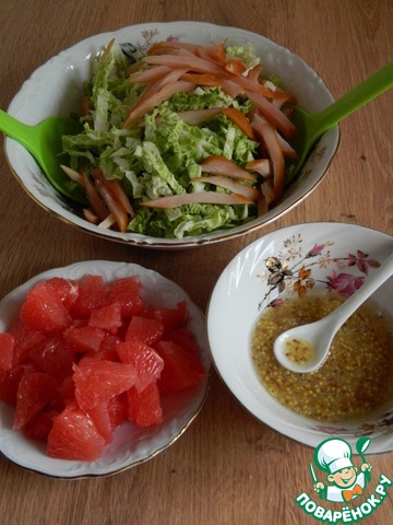 Этот легкий и вкусный салат станет частым гостем на Вашем столе. К тому же он очень быстро готовится, продуктов минимум. Осень пора, когда на рынке появляются необыкновенные грейпфруты. Если у них ярко красная шкурка, то и внутри мякоть красная, безумно красивая. Салат с таким фруктом очень красиво смотрится, на фоне зелени капусты. Зерна горчицы добавляют пикантности салату. Горчинка грейпфрута делает салат непредсказуемо притягательным.