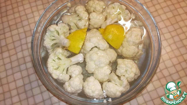 Цветную капусту разобрать на небольшие соцветия. Переложить в глубокую миску и залить водой, чтобы покрывала капусту.