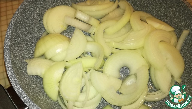 Лук нарезать полукольцами. Обжарить на подсолнечном масле в разогретой глубокой сковороде (лучше всего в чугунной) 2-3 минуты, пока не начнет менять цвет.