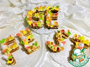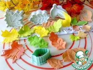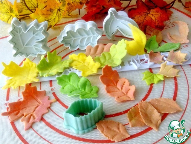 Для украшения я приготовила осенние мастичные листочки. Мастика у меня была готовая, листочки вырезала, просушила. Раскатывала тесто очень тонко и листочки получились нежные, мягкие.