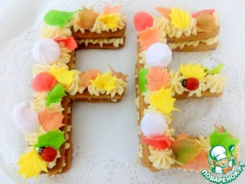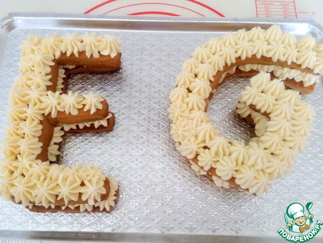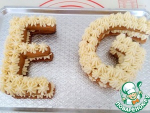 Выкладываем крем в кулинарный мешок с насадкой "звездочка" и отсаживаем на вырезанные буквы. Сверху кладем вторую букву, крем и ставим в холодильник.