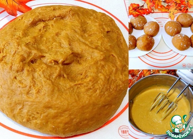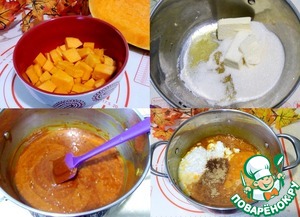 Для приготовления тыквенного пюре, тыкву нарезать на маленькие кусочки, поместить в мисочку, влить ложку воды и поставить в микро под колпак. Распарить тыкву в течении 5-6 минут, если осталась вода - слить. Затем пробить ее погружным блендером в пюре. На этом этапе взвесила, получилось 190г. В кастрюльке соединить - мед, сливочное масло, сахар и на небольшом огне, помешивая, дать раствориться сахару. Добавить соду и начинаем быстро размешивать, масса увеличится, поднимется пена, а так же поменяется цвет, снять с огня, какое-то время мешать на столе, она поменяет цвет в более насыщенный, дать постоять 8-10 минут. Затем добавить в смесь тыквенное пюре, слегка взбитые вилкой яйца, творог, добавить пряности.