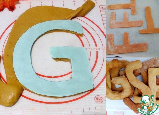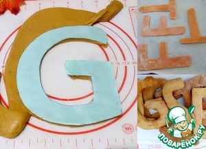После того, как тесто отлежится в холодильнике -брать по одному колобку, раскатывать толщиной 0,8 см, вырезать буквы и в духовку 180°C на 3-4 мин. Я вырезала по две буквы каждой, для двух ярусов, но теста и крема хватает и на три яруса. Из остатков и обрезков получился еще небольшой тортик. Готовые заготовки -лучше держать в пакете, чтоб были мягкие. Из такого теста готовятся и пряники, и торты.