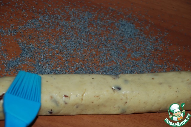 Вилкой взбиваем белок, смазываем бока "колбаски " и обсыпаем маком. Я просто прокатывала тесто по рассыпанному маку. Можно использовать крупинки сахара, кокосовую стружку.