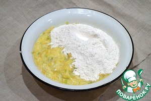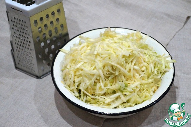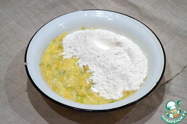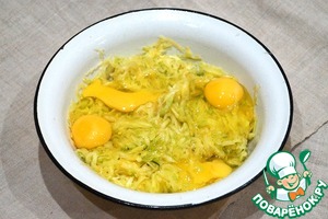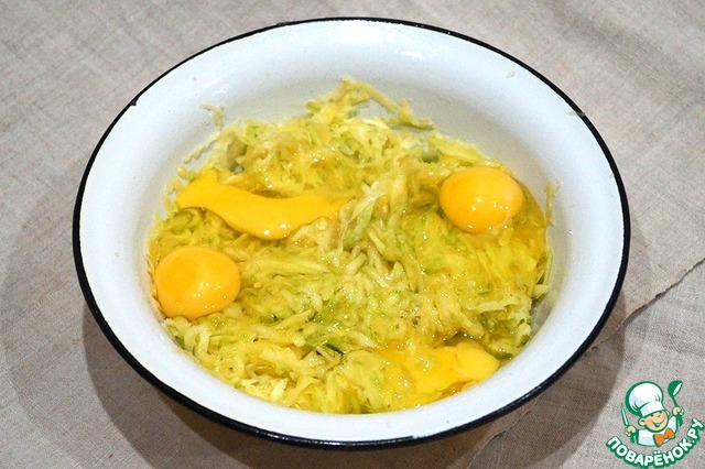 Молодой кабачок вместе с кожурой натереть на крупной терке. Посолить, перемешать и оставить на 20 мин. Кабачок отжать, весь выделившийся сок слить.