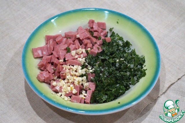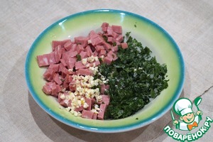 Зелень и чеснок мелко порезать. Колбасу нарезать кубиками
