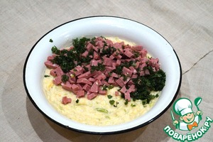 Добавить колбасу, зелень, молотый черный перец и чеснок. Перемешать.