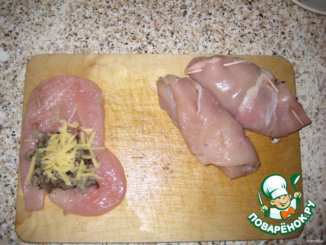 На каждую куриную грудку положить по ложке грибов и посыпать слегка тертым сыром. Свернуть рулетиком и зацепить швы зубочистками.