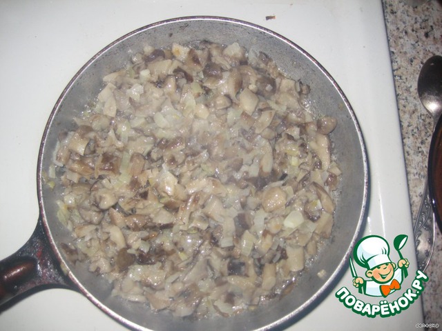 Лук и грибы мелко порезать и обжарить на растительном масле до готовности. Посолить и поперчить. Остудить.