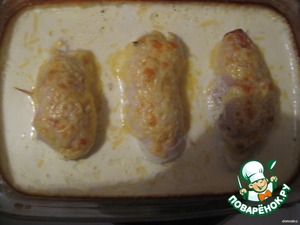 Рулетики положить в форму. Смешать сметану и майонез и развести бульоном, чтобы получился соус. Залить соусом рулетики и поставить в нагретую духовку примено на 30 минут.