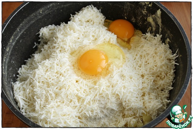 Добавить натёртую брынзу, муку, яйца, замесить мягкое, не липнущее к рукам тесто.
