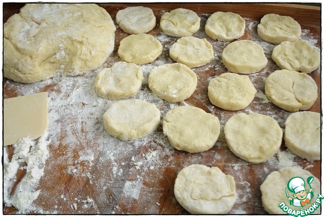 Поверхность припылить мукой, придать тесту форму колбасы, нарезать кружочками толщиной 1 см и придать кружкам любую форму.