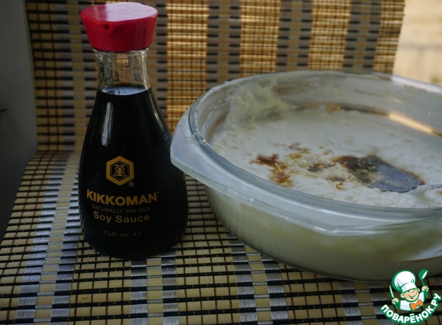 Добавляем соду и соевый соус. Соду гасить не нужно, т. к. она отреагирует со сметаной. А соевый соус подчеркнет вкус теста и сделает его ярче.